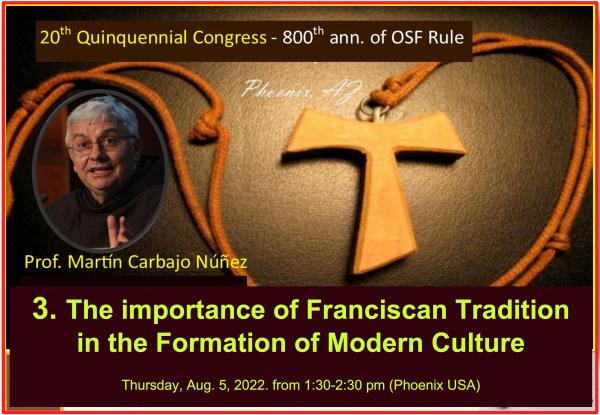 Prof. Carbajo will impart three conferences, 50 minutes each, on the current relevance of the Franciscan intelectual tradition and Charism. The sessions will be held at the conference auditorium of the Sheraton hotel, in downtown Phoenix. The Congress has been originally planned to take place on Thursday and Friday, August 19-20, 2021, but finally it has been moved to August 3-7, 2022 due to the Covid-19 pandemy .