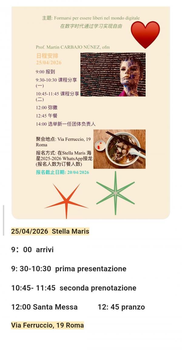 L’Unione “Stella Maris” delle religiose e consacrate cinesi a Roma ha invitato il prof. Martín Carbajo-Núñez a tenere due incontri formativi con loro a Via Ferruccio,19 ROMA, per affrontare alcuni temi legati all’uso etico dei social media e dell’intelligenza artificiale nella vita consacrata.